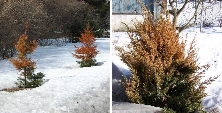 Частой причиной пожелтения и омертвения хвои после зимы (когда снег еще лежит, а солнце уже припекает, отражаясь от снежной поверхности) является весенний солнечный ожог туи. Чтобы спасти хвойные от такой ситуации, не стоит высаживать их тенелюбивые виды и сорта на яркое солнце, а растения на открытом пространстве (особенно молодые) на зиму до полного оттаивания желательно закрывать нетканым материалом, оставляя доступ воздуха. Если туя уже получила солнечный ожог, спасти ее может обильный полив и притенение.