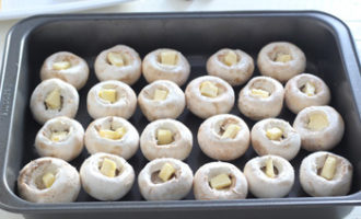 Распределите начинку по шампиньонам. Запекайте их при температуре 190 °C около 15 минут.