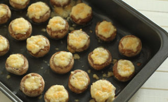 Запекайте грибы при температуре 180 °C около 20 минут. Затем посыпьте их тёртым сыром и готовьте ещё минут 10.