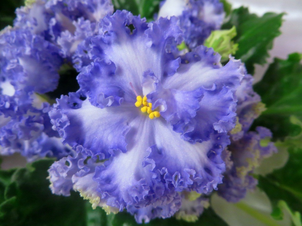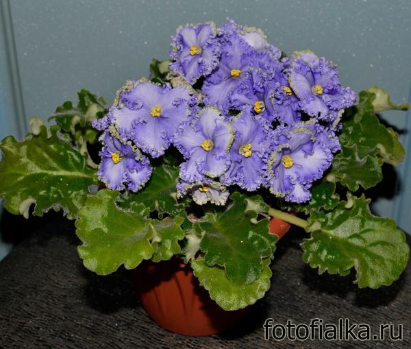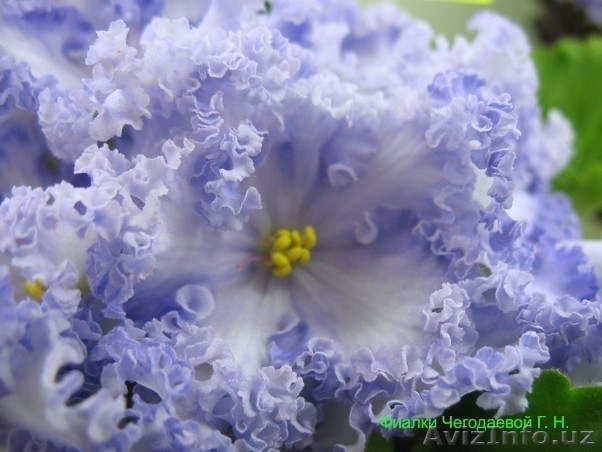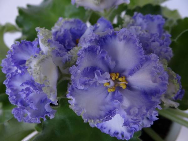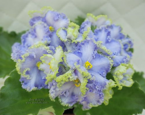 Воздушно-нежный сорт фиалки с нереально-потрясающим кустиком богато развитой розетки и фантастическими шапками из плиссированных венчиков с разнообразным сочетанием сиренево-голубых и бледно-зелёных оттенков в окраске лепестков.