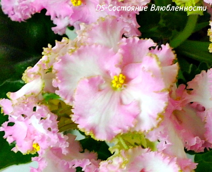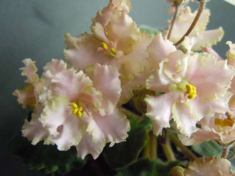 - Cajun’s Roses Anyone. Этот сорт славится тёмно-зелёными с кремово-розовой окантовкой сердцевидными листьями и нежно-розовыми плотными цветочками, похожими на фарфор. Крепкие и довольно плодовитые цветоносы, на каждом практически по 5–7 бутонов, возвышаются над небольшой, до 22 см в диаметре, но очень красиво сформированной розеткой.