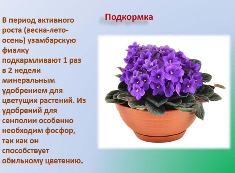 Укреплению корней способствует фосфор, а если у растения хорошо развита корневая система, значит, растение будет обильно цвести. В период роста розетки фиалке необходимы органические удобрения, в период цветения – калийные.