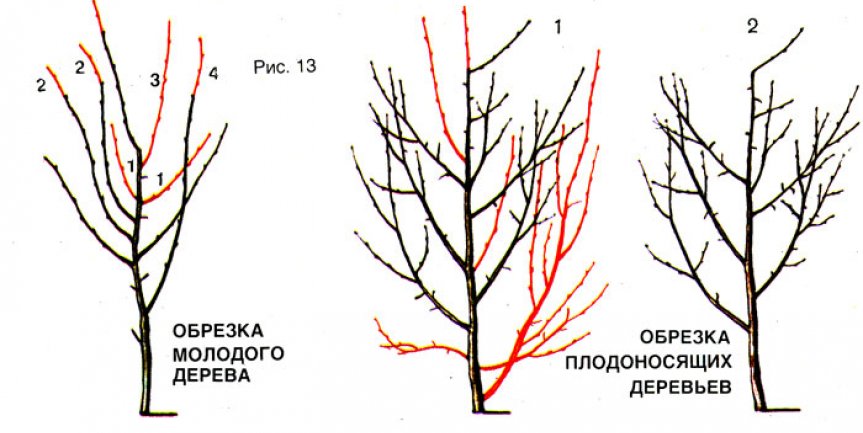 Для активизации роста дерева каждые 4-5 лет проводят омолаживающую обрезку. Во время этой процедуры отсекают центр коронки и скелетные ветви, относящиеся к периферическим. Для удобства можно нарисовать схему обрезки.