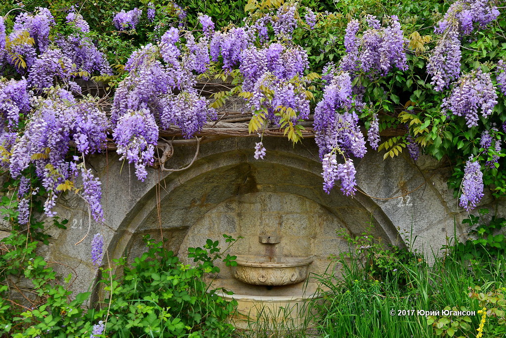 На большой территории эффектно смотрятся арки и коридоры из глицинии.