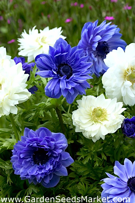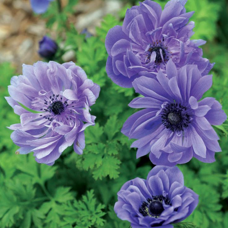 - Анемона махровая голубая (анемона махровая блу, Anemóne Blu) – невысокий куст цветущий красивыми цветами напоминающими пион. Предпочитает теневые места и своевременный полив. Цвет соцветий голубой.