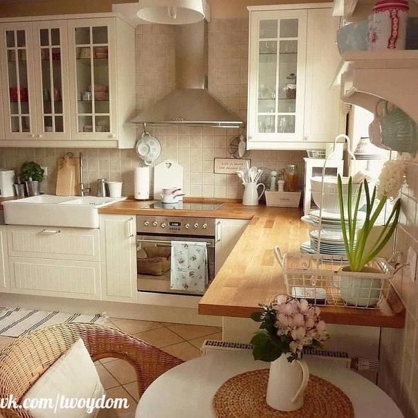 Кухня, выполненная в стиле прованс, всегда выглядит очень уютной и теплой. Она как бы наполняется светом и переносит обитателей жилища в атмосферу южной французской провинции.