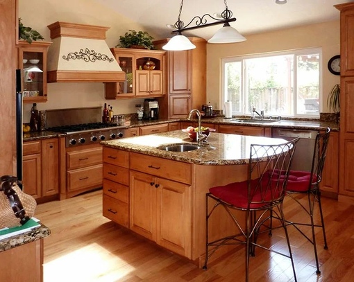 Этот вариант подходит только для просторных кухонь, в маленьких помещениях воплотить дизайнерские фантазии не получится. В интерьере классического типа островной элемент монтируется в центральной части комнаты, при условии, что она правильной формы (прямоугольник или квадрат). Оптимальная площадь должна быть не меньше 15 м кв. От края рабочих поверхностей мебели до края острова должен быть отступ от 1, 5 метра.