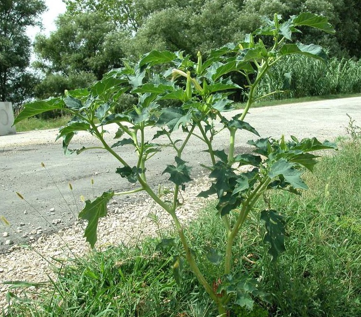 Дурман в изобилии произрастает в различных частях света. Пустыри, обочины дорог, огороды – такие места обитания выбирает дурман. Фото и описание представляют довольно высокое, до полутора метров, травянистое растение с толстым стеблем и большими зубчатыми листьями. Корень – белый, длинный, стержневой.