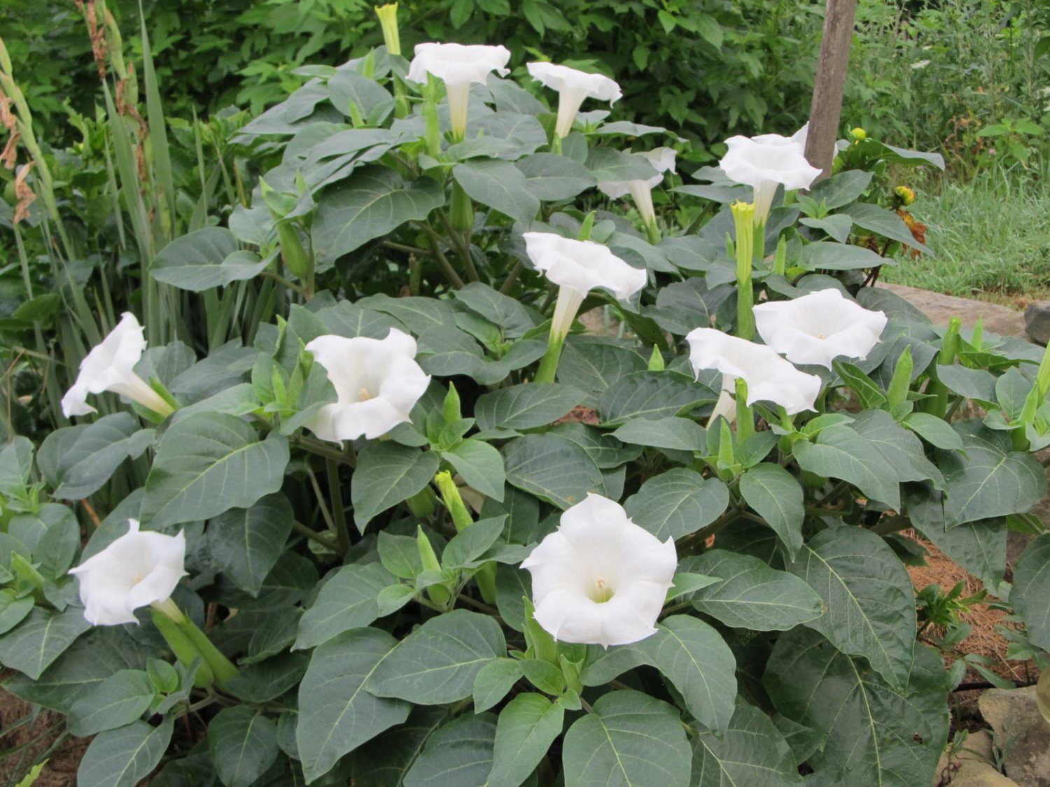 Выращивают дурман на дачных участках в основном из-за красивого цветения. Особенно хорош для сада дурман индийский с его крупными белыми соцветиями. Увидев чашечку в форме колокольчика с пышными лепестками причудливых форм, можете не сомневаться: перед вами – дурман-цветок. Фото декоративного дурмана, которые без труда можно найти в Интернете, демонстрируют кусты, сплошь усыпанные яркими бутонами. Природный цвет лепестков – белый. Сиреневый, фиолетовый, жёлтый, пурпурный – гибридные формы, выведенные человеком. Некоторые виды образуют очень красивые цветки в виде звёзд или с завёрнутыми лепестками – наподобие роз, пионов.