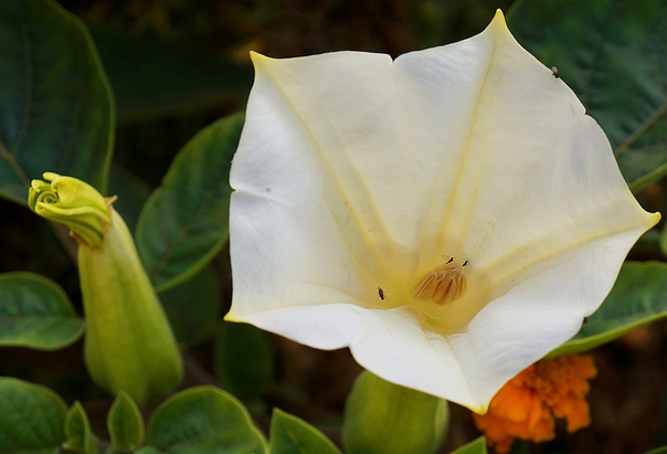 Некоторые виды дурмана имеют вытянутые, изогнутые фрагменты на лепестках. Распускаются бутоны к вечеру.