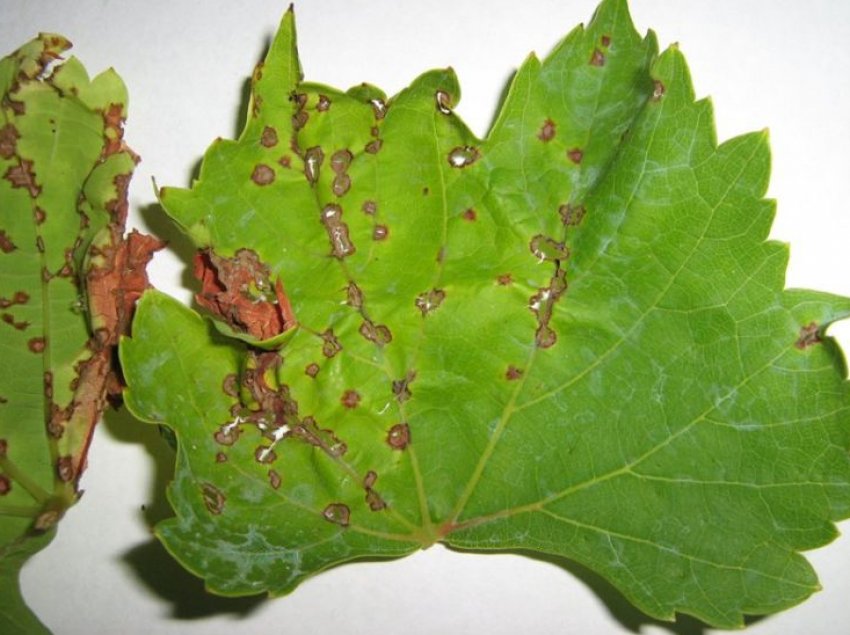 На листьях появляются светлые пятна с характерным проявлением некроза в центре, затем виноградный лист темнеет покрываясь плесенью во время дождей. На ягодах образуется пелена, придающая виноградным ягодам металлический блеск с последующим образованием бархатного налёта.