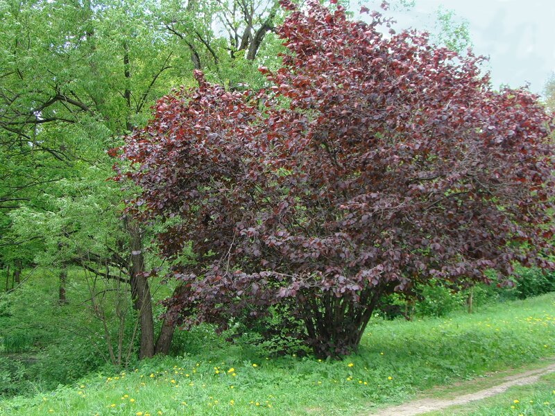 Особенно красив фундук краснолистный, особенно, когда цветут яблони.