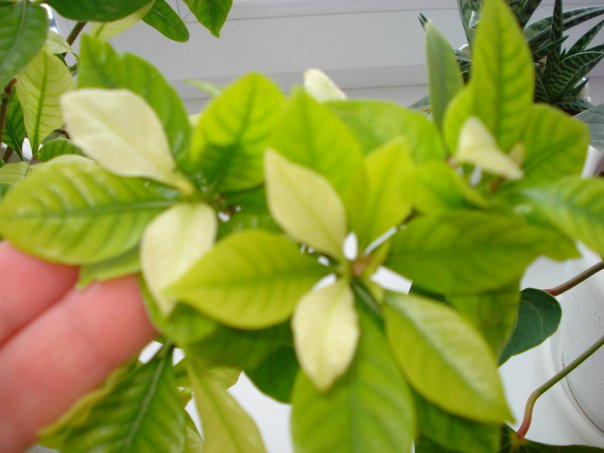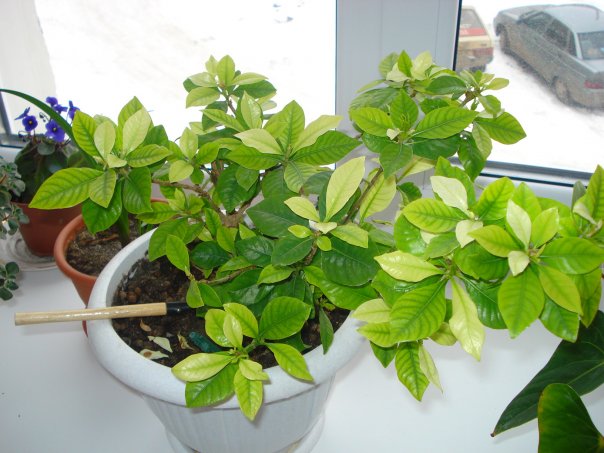 На листьях можно видеть мезжилковый хлороз или пожелтение в виде разводов — при защелачивании почвы — гардения нуждается в кислом субстрате. Если пересаживают гардению через 2-3 года, то верхний слой земли, который, как правило, накапливает соли кальция в виде белой корки, если поливать не достаточно мягкой водой, можно заменять на свежий ежегодно.