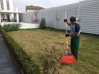 - подметите поверхность газона веником или граблями, чтобы разровнять кучки земли после дождевых червей и приподнять траву навстречу лезвиям;