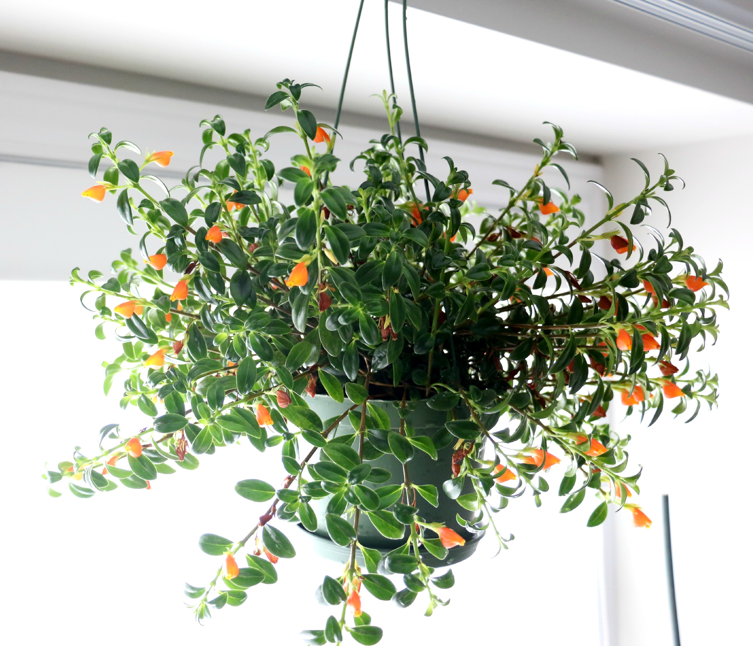 The Plant: The Goldfish Plant имеет кожистые, блестящие темно-зеленые листья на жестких стеблях, и ярко-оранжевые продолговатые трубчатые цветы с открытыми губами близко к стеблям.