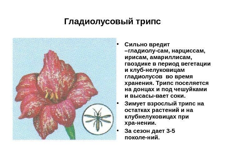 Некоторые виды трипсов серьезно повреждают гладиолусы, причем гладиолусовые трипсы наносят наибольший ущерб. Удлиненные черные взрослые особи размером 1/16 дюйма и более мелкие желтоватые нимфы вызывают повреждения, разрывая нежную эпидермальную ткань листа, цветка и клубнелуковицы и высасывая сочащиеся из растения соки. Цветочные почки могут быть повреждены, так что хорошего цветения не получится. Самки откладывают яйца в прорези, сделанные на поверхности листьев. Для созревания нимф требуется от 2 до 4 недель, что позволяет дать много поколений за один год. Они зимуют в клубнелуковицах.0007 Жизненный цикл можно прервать, если хранить клубнелуковицы при температуре 40–45°F или замачивать их на три часа в 1,25 столовых ложках дезинфицирующего средства на галлон воды непосредственно перед посадкой. Мельчайшие насекомые прячутся в чехлах стебля цветка, где их трудно достать спреем.