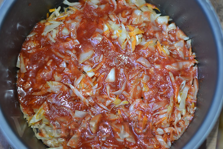 - Лук с морковью в томатном соусе отодвигаем в сторонку или вынимаем из чаши мультиварки. На их место укладываем готовые голубцы. Если получается два или три ряда, то выкладываем между ними часть обжарки.