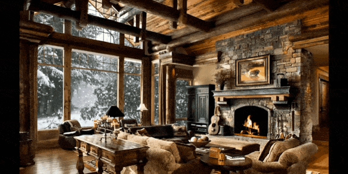 Гостиная в загородном стиле с элегантным диваном и центральным столом, расположенным поверх стильного ковра. В номере есть большие стеклянные окна, из которых открывается захватывающий вид на окрестности. Рядом с домом растут комнатные растения.