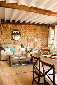 Источник: Home BayВ этой великолепной гостиной в загородном стиле стены выложены каменной мозаикой, а полы из терракоты дополняют деревянный диван, кресло и журнальный столик.Эти деревянные элементы гармонично сочетаются с деревянным потолком с открытыми деревянными балками.