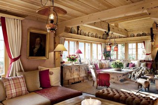 Источник: Home BayНа белом потолке этой гостиной в загородном стиле преобладают открытые деревянные балки, согреваемые желтым светом маленькой люстры, висящей над деревянным журнальным столиком.Он окружен диваном и двумя парами мягких кресел с разными узорами зеленого и красного цветов.