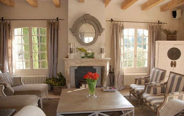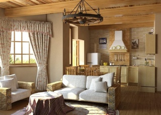 Вся мебель выполнена из светлого дерева. Присутствие камина является обязательным, перед ним можно усесться в плетеное кресло с чашкой ароматного чая, укутавшись в плед.