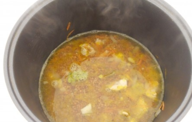 6) Когда до окончания программы останется 20 минут, добавьте в чашу мультиварки предварительно промытую гречку и залейте водой. Также кладем специи и немного соли.