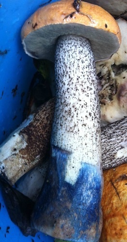 Мякоть белая, но сделать фото этого цвета крайне сложно, потому что изменение на синий происходит очень быстро. Показанное здесь молодое плодовое тело было разрезано примерно за 5 секунд до того, как был сделан снимок.