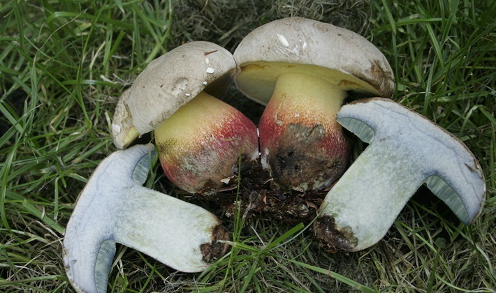 Если вы не знаете, какой гриб на срезе синеет, но на вашем пути встретился вот такой красавец, будьте предельно осторожны. Это так называемый «сатанинский гриб», или ложный белый. Внешне он действительно имеет сходство с боровиком. Та же плотная мясистая ножка, выпуклая шляпка, но есть ряд отличий! Белый гриб на срезе не меняет окраски. Мякоть ядовитого двойника моментально синеет или розовеет. Кроме того, ножка сатанинского гриба покрыта выраженной сеточкой, а окраска намного ярче, чем у боровика.