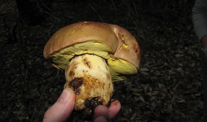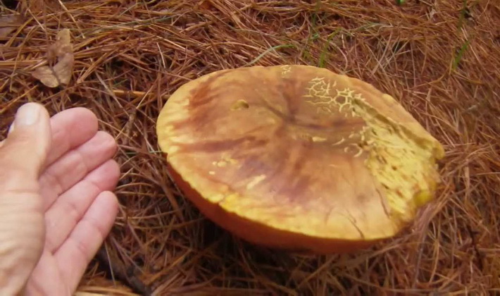 Этот гриб часто путают с сатанинским – двойником белого гриба. Но отличие в том, что у ядовитого представителя этого вида надлом сначала розовеет, а уж потом синеет. У белого съедобного гриба окраска на срезе не меняется, запомните это! Какой гриб синеет на срезе? Сатанинский, который имеет шляпку, по цвету напоминающую белый гриб, но споры под ней красного или оранжевого цвета. Его ножка отличается ярко-желтым цветом с красным узором в виде сеточки.