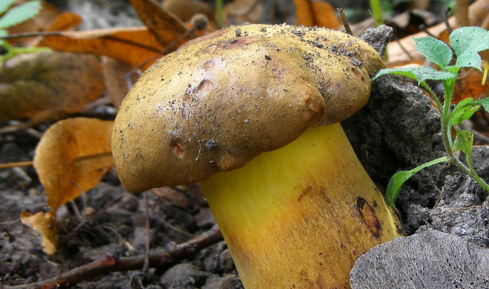 Диаметр его шляпки достигает 15 см. У молодого гриба она выпуклая, а у взрослого – распростертая. На бурой или желтоватой шляпке можно увидеть едва различимые трещинки. Грибы на срезе синеют, если к ним прикоснуться и надавить. Поэтому их невозможно перепутать с ядовитыми грибами, которые лишены такой способности. Под шляпкой расположены желтые споры и трубочки, которые мгновенно синеют при малейшем воздействии на них. Ножка плотная, клубневидной формы. Ее структура постепенно разрушается. У стареющего гриба она полая.