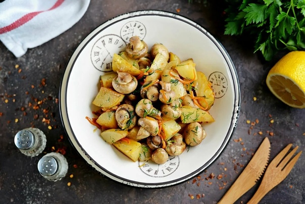 - Из-за разных техник приготовления, лук и шампиньоны обычно обжаривают одновременно на отдельных сковородах либо в одной и той же посуде, но поочередно. Так же поступают и с картофелем: обжаривают его до готовности, смешивают с поджаренными грибами.