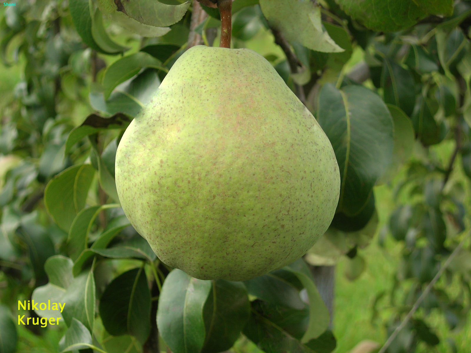 Плоды очень крупные (200-250 г), правильной грушевидной формы, зеленовато-желтые со слабым «румянцем» и заметными подкожными точками, с нежной сочной мякотью средней плотности, хорошего сладкого вкуса, средне ароматные.