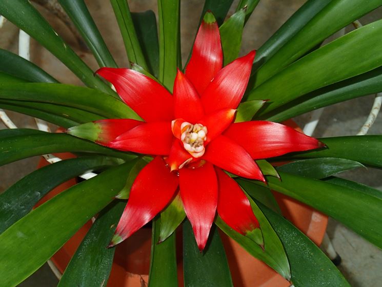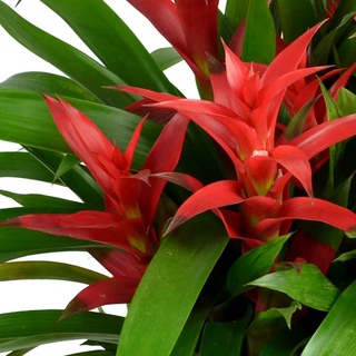 Гузмания цветет лишь один раз на втором или третьем году жизни. Колосовидное соцветие из неприметных белых цветочков окружено яркими листьями-прицветниками. Именно они придают растению эффектный внешний вид. Их окрас может быть красным, желтым, оранжевым или розовым.