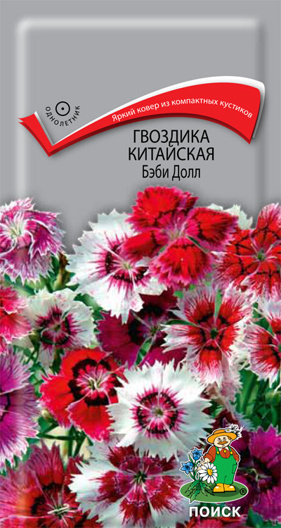 - Гвоздика китайская + бородатая Идеал Селект. Это крупноцветковый межвидовой гибрид букетного типа цветения. Диаметр цветков — до 4 см. Куст разрастается в ширину около 20-25 см. Серия хороша для ландшафтных посадок и выращивания в контейнере. При получении из семян гибрид зацветает через 9 недель после всходов.