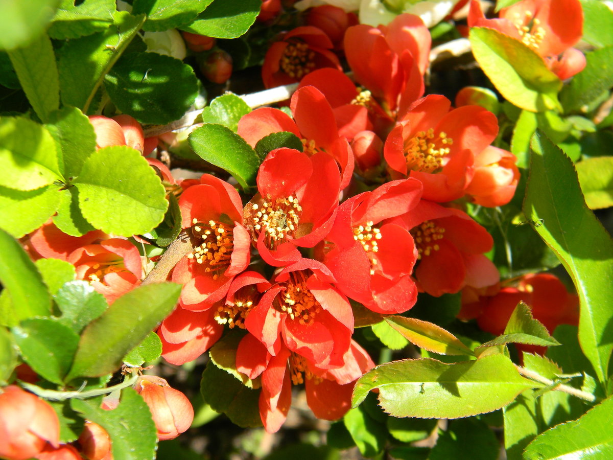 Селекционеры вывели много сортов хеномелеса, и все они могут похвастаться роскошными цветками. Бывают разнообразными по окрасу: от ярких красных и оранжевых до нежных белых и розовых. Располагаются цветки айвы на побегах бессистемно — то по одному, то соцветиями из 3-5 цветков. Поперечник цветочка 4-5 см.