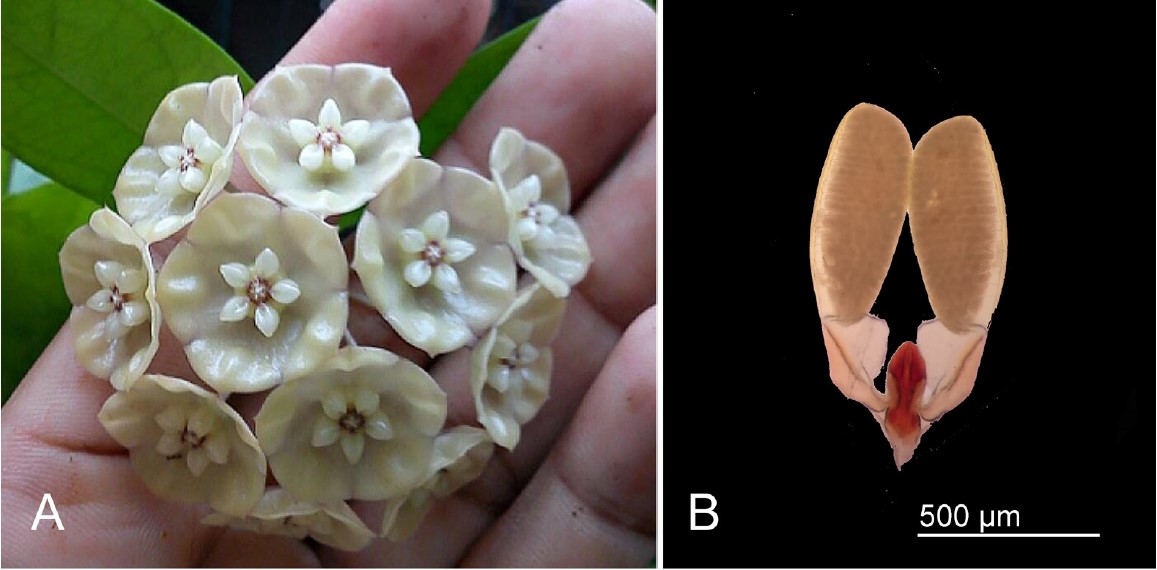 Вечнозелёная лиана, длина которой достигает 6 м. Темно-зелёные листовые пластинки мясистые, овальные. Зонтичные соцветия состоят из 12-15 бутонов. Цветы очень ароматные, розового или белого цвета, коронка тёмно-красного оттенка, цветёт 2-3 раза, с июня по октябрь.