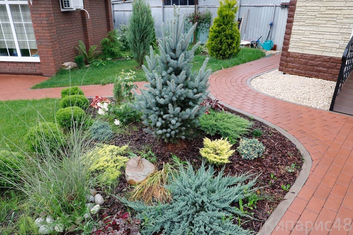 Обратите внимание, как на фото клумбы с хвойниками скрывают дефекты территории.