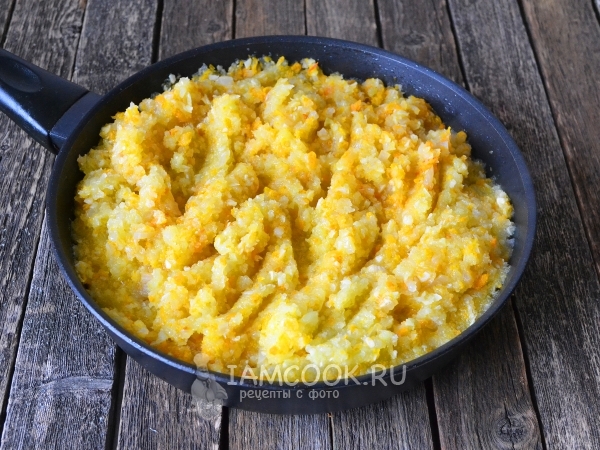 Переложит лук в глубокую миску, помогая себе столовой ложкой, сковороду снова поставьте на плиту и налейте в нее вторую порцию масла.