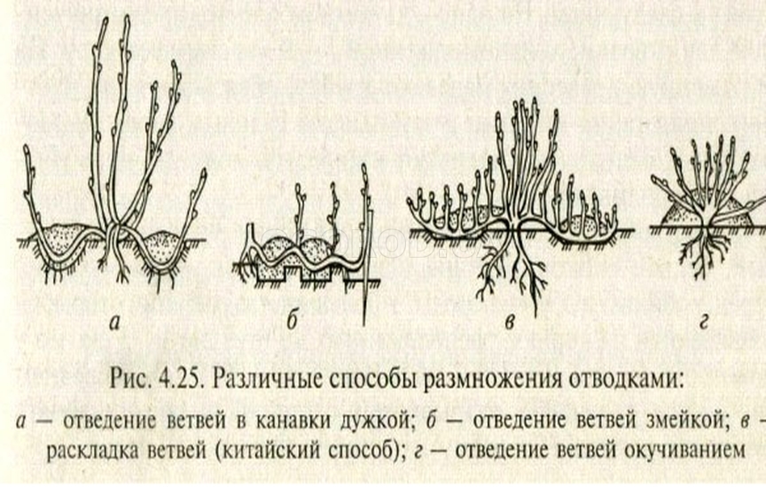 3. Китайскими отводками. Когда побег укладывается в канавку на 10-15 см глубиной и постепенно засыпается землей по мере роста побегов из почек. От одного отводка можно получить 6-15 саженцев. Но в полное плодоношение они вступят только на пятый год. Если отводить сразу несколько побегов – это ослабит материнский куст и тоже скажется на плодоношении.