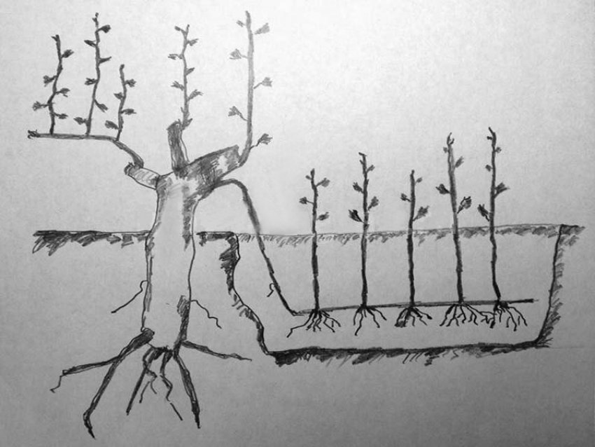 Китайскими называют отводки, выполняемые полным укладыванием одревесневшего побега в землю.