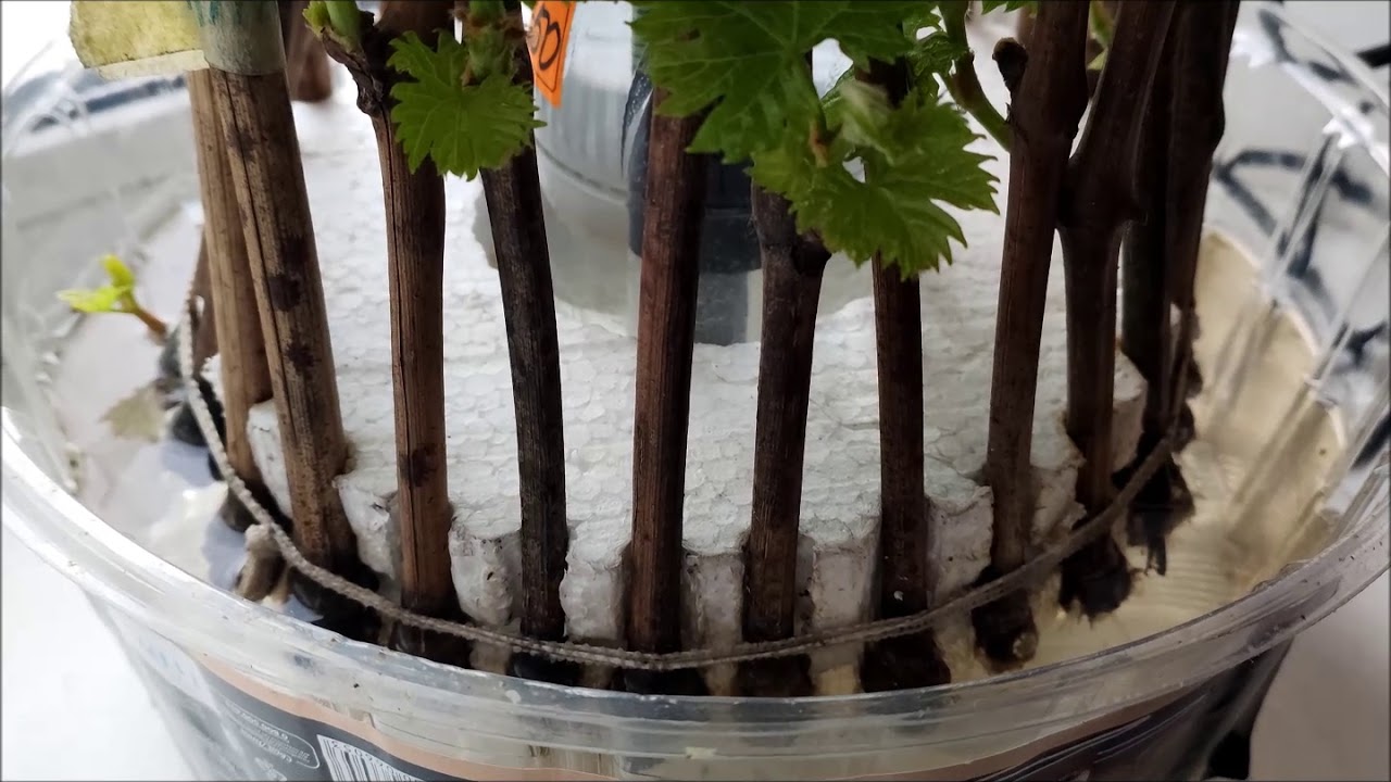 Отрастать корешкам не дают, и если погода позволяет, черенки с зачатками корней глубоко сажают в грядку. В таком варианте нет смысла делать черенки короткими: можно и с 6 почками сажать, сильнее будут корни. При наклонной посадке весной над землёй оставляют две почки. Хорошо поливают и поддерживают почву во влажном состоянии. Если ещё возможны заморозки, накрывают неткаными материалами.