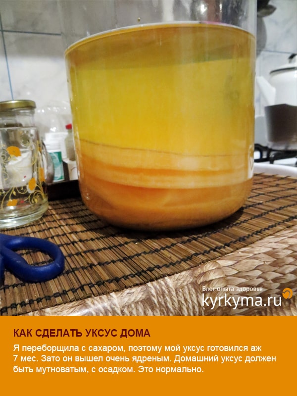 Когда уксус посветлел, а уксусная матка начинает опускаться на дно — наш органический полезный продукт готов! Аккуратно переливаем в бутылки, укупориваем и отправляем на хранение в кладовую или у кого куда есть. Чем дольше будет стоять уксус, тем больше он будет светлеть. На поверхности будет образовываться уксусная матка, а в осадок будут выпадать хлопья, не интенсивно, но будут.