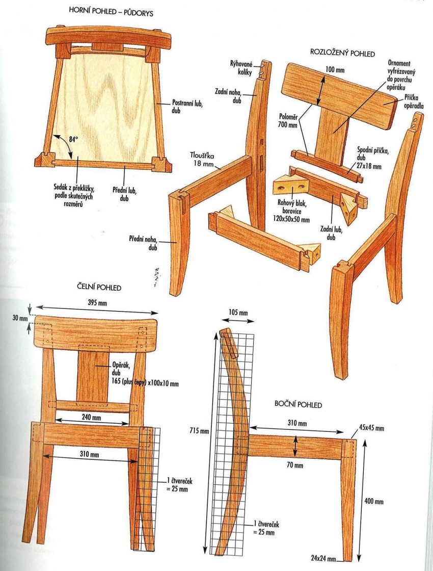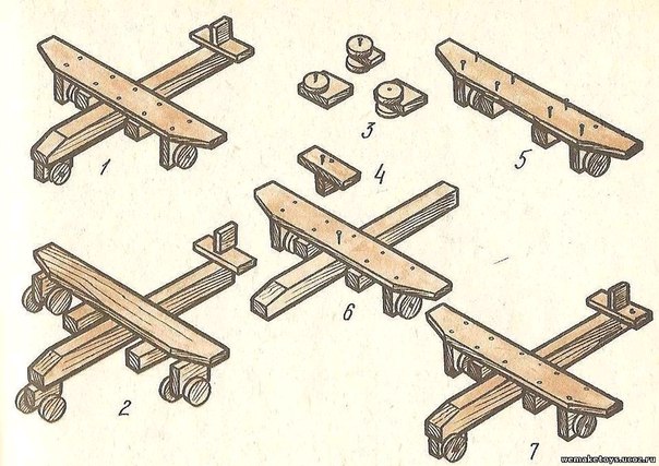 Для их изготовления используется брус размером 5х15 см и доска толщиной в 3-4 см. Все деревянные детали скрепляются с помощью гвоздей. Из двух досок длиной в 1 м делают опору.
