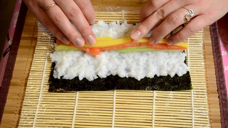 На бамбуковый коврик нужно выложить лист нори, глянцевой стороной вниз. Не смачивайте его как при приготовлении обычных суши и роллов. Аккуратно выкладывайте сверху и распределяйте рис, оставляя один край свободным. Создав ровную и плотную поверхность, выкладывайте в центр начинку. С помощью бамбукового коврика сформируйте плотный и аккуратный ролл.