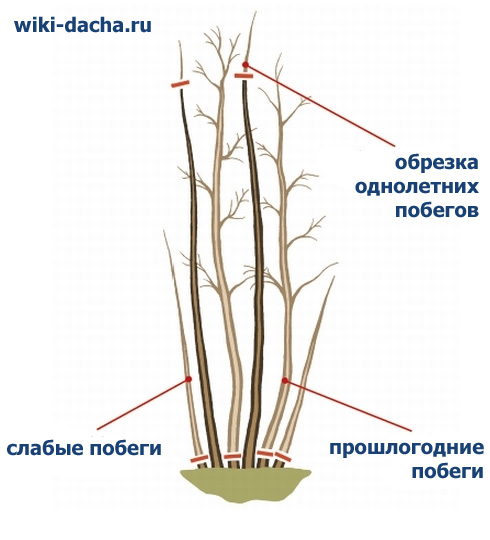 Летом, после плодоношения (слева) старые побеги легко отличить по наличию коры; весной (справа) все побеги уже одревесневшие, отыскать среди них старые сложно