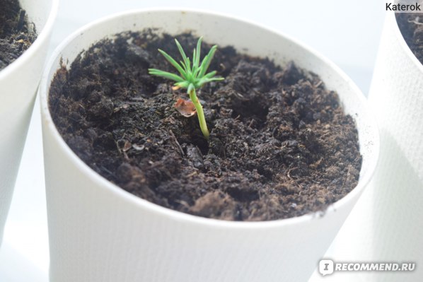 Росток кедраГоршочек должен находиться в прохладном месте. При температуре выше +18…+20 °C семя может не проклюнуться. Также растению противопоказаны прямые солнечные лучи. Время от времени увлажняйте почву, поддерживая лёгкую влажность её верхнего слоя.