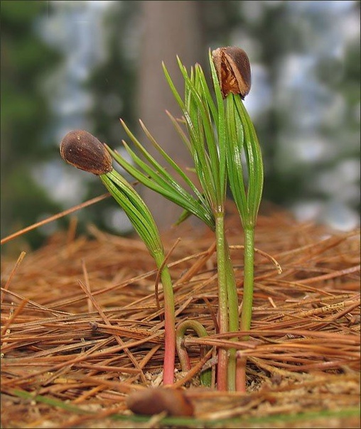 Всходят кедрики необычно и очень мило)) Из орешка сначала уходит вниз корешок, а потом из корешка начинает проклевываться росточек, поднимая орешек на верх, т.е. из земли будут видны маленькие зеленые росточки с орешками на верхушке. И это очень нравится птицам, особенно воронам. Поэтому весной, когда кедрики начинают всходить (а можно и сразу после посадки), обязательно укрыть ветками, иначе их склюют пернатые друзья.