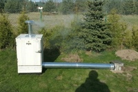 Играющая роль топки железная ёмкость соответствующего объёма вкапывается в землю ниже уровня коптильной камеры. При таком расположении топки дымоход от коптильной камеры прокладывается тоже в земле, а это позволяет охлаждаться дыму.
