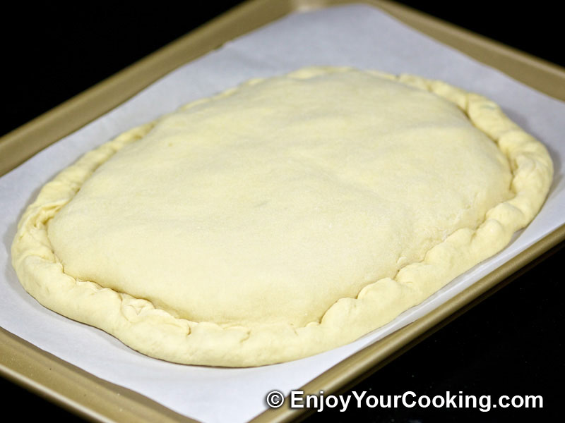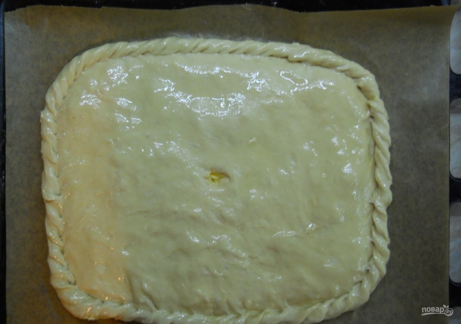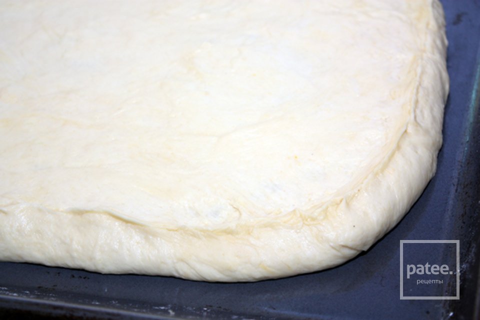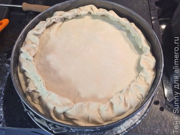 Вторую часть теста можно либо раскатать, либо слегка смазать стол маслом и растянуть руками по размеру пирога.