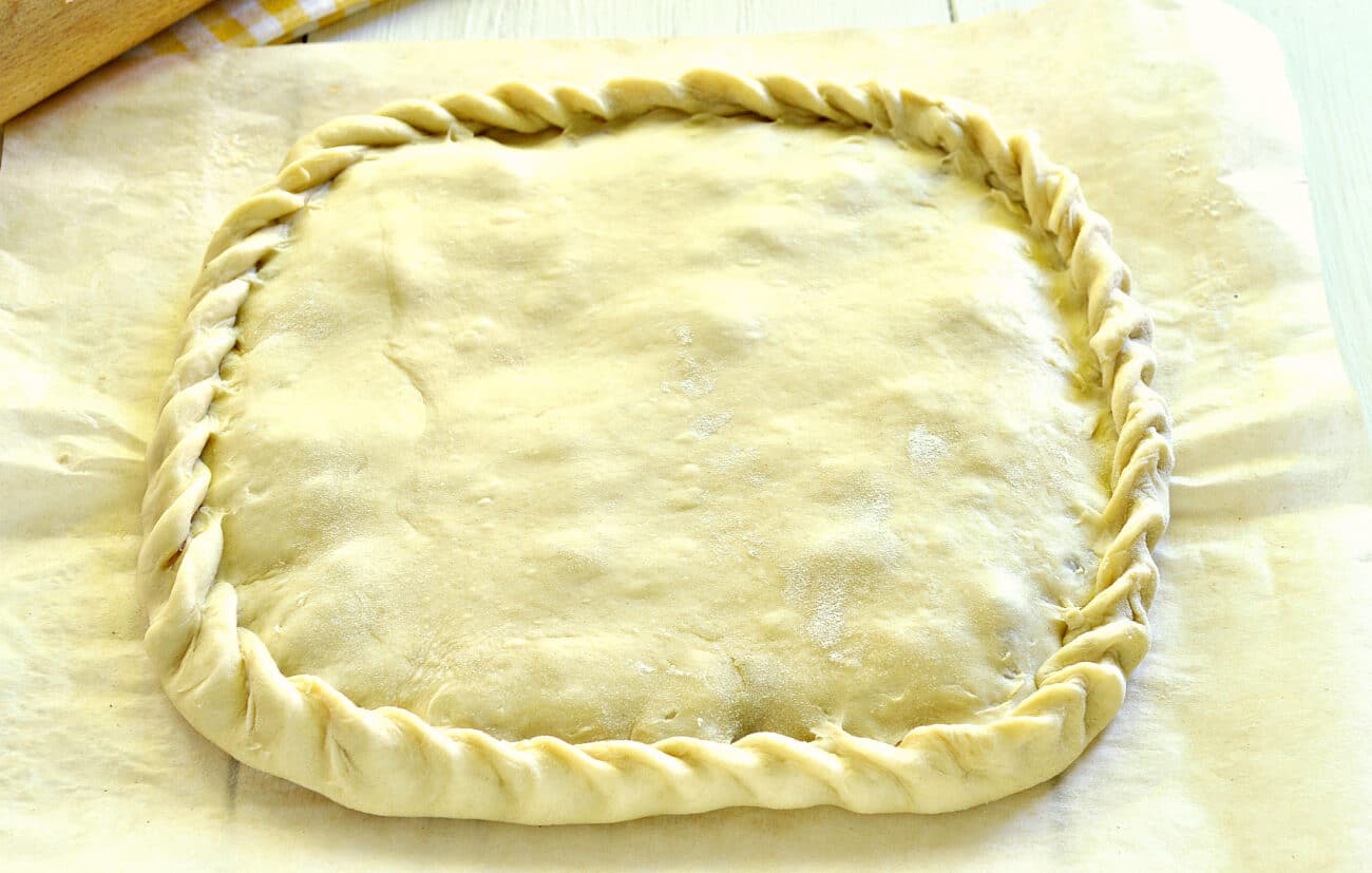 - Аналогично технике шахматной доски загните все остальные выступы в центр корочки пирога.